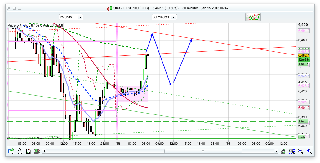 Good morning. Wow, whats a day that was yesterday – not one for the faint hearted at all. Really didn’t expect to get an alert on my phone while out that said the price had hit the bottom of the 20 day Bianca at 6350 – which has held really quite well and now we are at 6465 as I write this! Certainly arrested the fall at that level. The early long did alright for a few points but once again, it was tricky trading – though when is it ever that easy. If it was, everyone would do it! US bullishness was dampened by a poor retail result yesterday, dollar weakened and equities fell. However, all eyes remain on the US to drive the global economy at the moment, with the American economy growing at its fastest pace in over a decade in the third quarter of 2014, reaching an annualized rate of 5 percent. With Brazil stagnating, Russia entering a recession, and India struggling to implement economic reforms, you can see why. The Davos meeting could be interesting this year!