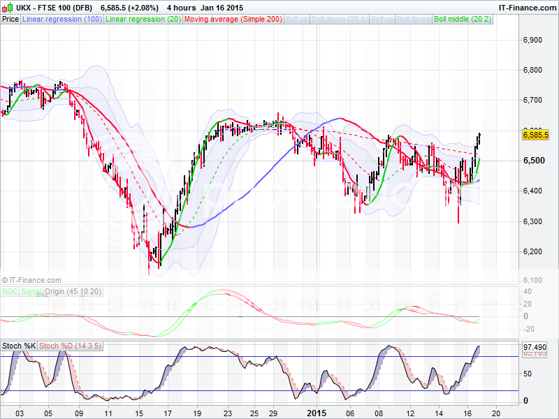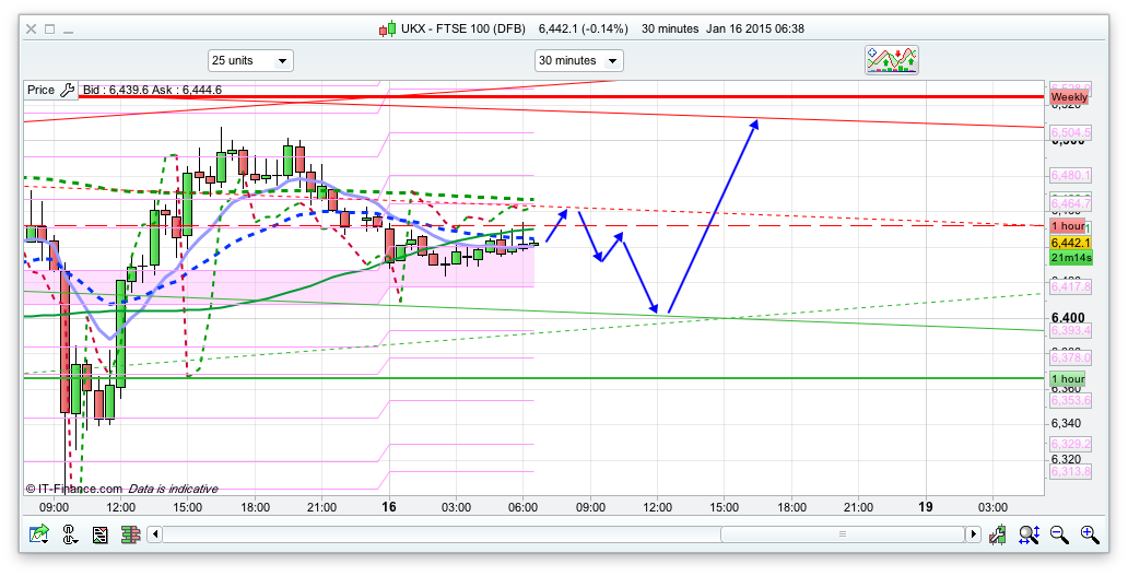 Good morning. Well, glad I wasn’t trading forex yesterday! As I am sure you are all aware the Swiss caused chaos and calamities from New Zealand to New York with their announcement yesterday that they were removing the cap on the Swiss Franc. Reverberations were felt around the world at the time, and are still ongoing, with the FTSE dropping over 150 points in minutes to a low at around 6290. A lot of people got caught out with that, including hedge funds, spread bet firms and all sorts. We nearly hit the 6510 resistance though at the bell after quite a recovery from the lows (volatility’s still here then!), and have dropped back overnight. Thats still the line in the sand though might be a good move to just come back Monday. First support is 6432.