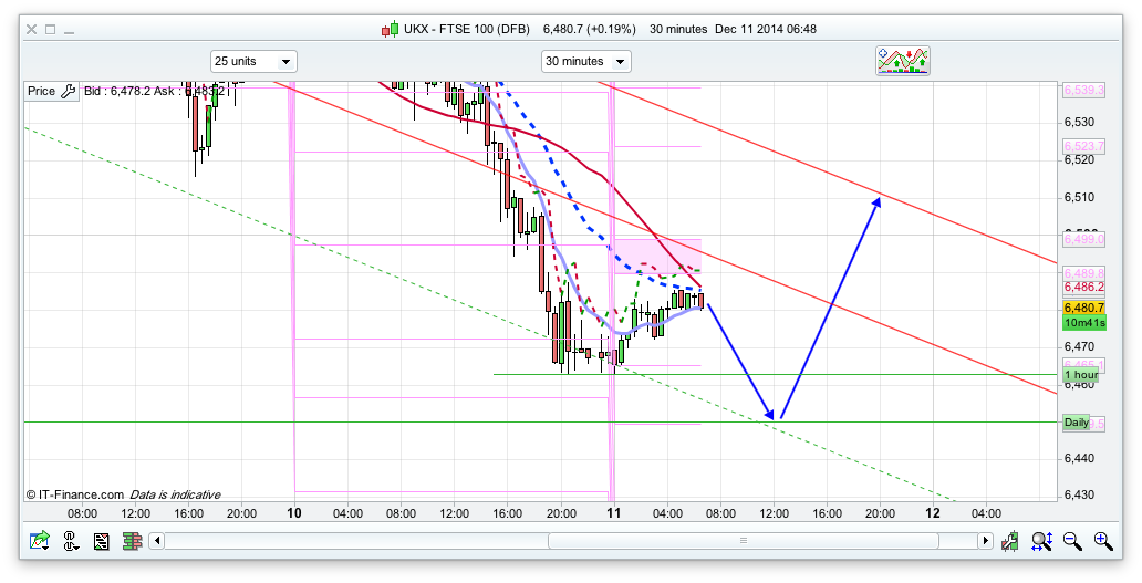Good morning. Well that was rather bearish again. Oil continues to drop and is dragging the FTSE down with it. Got a great catch going long at 6532 for a quick bounce and all was going well. For a little while,then it dropped back and had a very bearish evening as the US sold off again too. We are up off the overnight lows now, and didn’t quite reach the 6444 lowest support I had for yesterday. The bottom of the 10 day Bianca today is 6452 (20 day Raff is same area) – will we see that? Quite possibly as we are in a declining 30 minute channel, the Fed are in a blackout period so can’t help, but we do have the ECB releasing their monthly report later at 9am, and US retail sales for November and jobs data at 13:30.