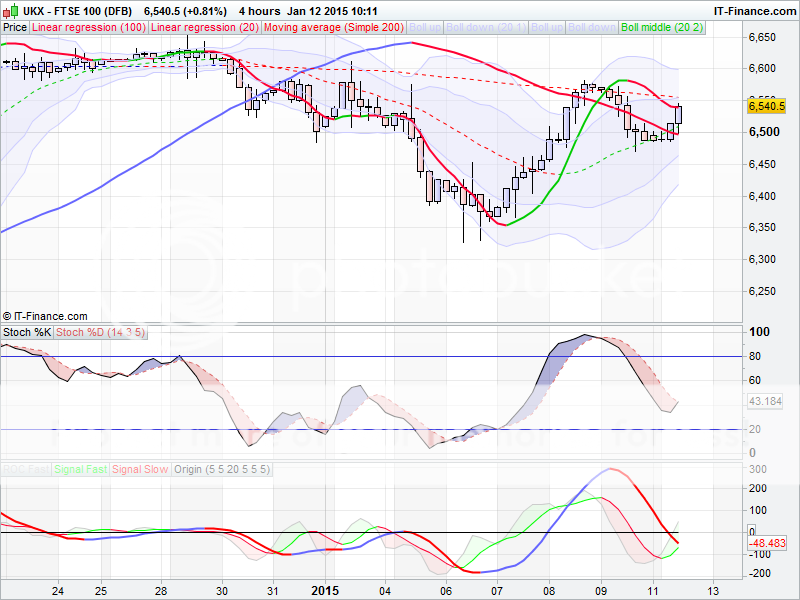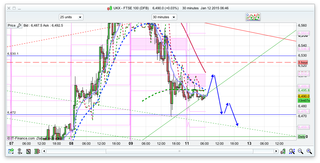 Good morning. I hope you had a good weekend. Most of the press was dominated by the France shooting and the march of 3 million people yesterday. Futures prices for the S&P and FTSE have stayed relatively flat over night, though Friday saw the bears take a bit of control. With the top of the 10 day Bianca at 6578, and the current price around the 6500 area, together with the Raffs pointing down on the FTSE (just) there is a slight negative Bias for me at the moment, despite that recovery last week by the bulls from Wednesday. Resistance today is initially the daily pivot at 6515 and then 6530, top of a 30min channel at 6555, then Bianca at 6578.