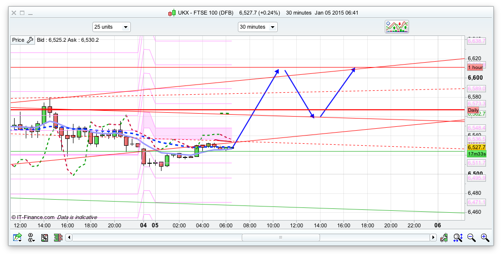 Will it be a case of making hay while the sun shines before the Greece situation really kicks off and we get a rise to test the 6610 level? Above this then a move to 6625 and 6650 looks possible, though there are more resistance levels being flagged up than support at the moment, The daily pivot is 6555 and I feel we will get an early test of that to start things off today. The 30 minute chart EMAs are brewing for a cross, though the daily have crossed to bearish with that weak end to 2014, flagging resistance on that at 6546. The top of the 10 day raff is at 6586, so the bulls have a bit of work cut out this morning if they are going to reach 6610 – maybe a fast spike up to break through those levels without much of a pause?