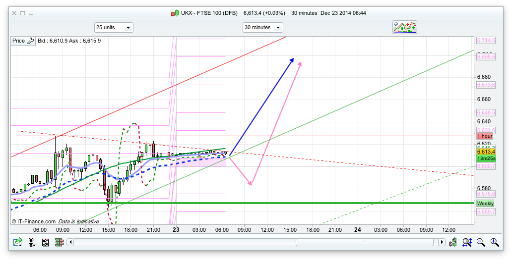 Good morning. An interesting day yesterday whose opening spike has set the tone for a rise to 6650, with the 6597 resistance breaking. However, it stalled around the 200ema on the daily at 6630 and dropped back before rising again, typical bear Monday! Not so int he US however where the S&P closed at a new all-time high. Today is the last full trading day before Christmas as its a half day tomorrow and I wouldn’t be surprised if we push up to the 6650 area. I won’t be sending an email tomorrow as not trading, but the chat room will be open as per usual. Next email will be a brief one on the 29th.
