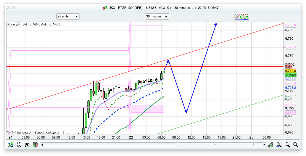Tricky one to call today really as its going to be so news focussed. Support is at the pivot 6695 and there is the bottom of the 30 minute channel at 6680ish. On the upside, we have the 10 day Bianca channel top at 6772 so may see a bit of profit taking on long there if its hit prior to the ECB news. They could announce anything really, so sometimes its best to keep your powder dry. I have plotted the arrows for a dip off that 30min channel around 6755, down towards the pivot and then another round of buying. I am 50% confident in todays arrows just so you know! I will try a long at the pivot area 6695 stop 6680 and see what happens. That said, we have some PRT resistance on the daily around 6750, and the rsi(10) is at 70 so a little overbought at the moment – they might well want to slow this rise down a bit, so support below the pivot is at 6655 and 6635. 6600 for a bit of round number support.