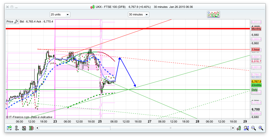 With the overnight drop since the futures markets opened, I am expecting a rise initially towards the pivot area at 6823 (and Fridays close 6832). However, the Greek election result will certainly rattle the Eurozone as it means that they are firmly against their imposed austerity and loan obligations – a bit of a headache for Germany and the the rest of the Eurozone. As such I have planned for a fairly straightforward rise to there and then a dip. There is an outside chance that the bulls can take it further to test the 6872 top of the 20 day Bianca level but I don’t think so, especially with the S&P dipping off the top of the 20 day Raff join Friday at 2065ish (now 2040). If the FTSE does dip from that pivot area then a break of 6798 again will likely lead to the bottom of that 30minute channel around 6750, and the next support below that is 6730 and 6710. The bottom of the 10 day Bianca is at 6690 – quite possible that we test this line today or tomorrow. If we do then the immediate uptrend that everyone was so bullish about last week is broken.
