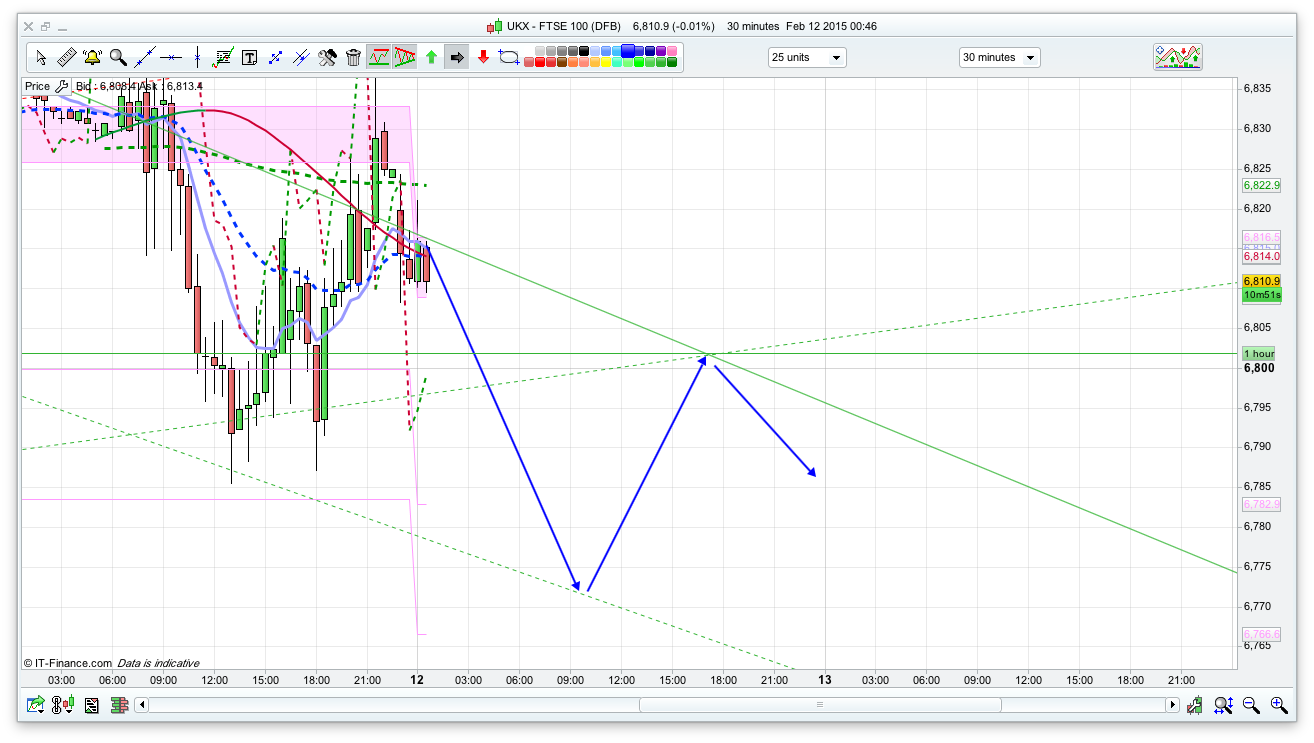 Good morning. Nice long trade yesterday off the 6793 level, which, thanks to a rumour that Greece had reached an agreement, in principle, with the European Union to stay in an EU bailout program, saw it run to the target of 6850. I closed it at 6811 after collecting the 12 point divi as it could pretty much go anywhere at the moment, so happy to bank a few points. It looks like “they” are certainly keeping the FTSE below the 6855 level, as there has been any number of shorts off that level this week. A break of that will likely see a retest of 6900 and 6922 – think its safe to assume it would need positive EU/Greek news for that.