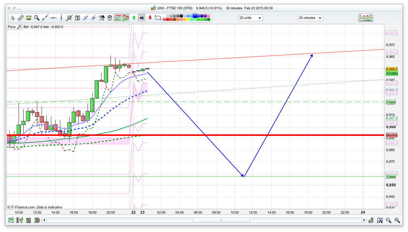 Good morning. Well the big news last Friday was the Greece deal, which saw markets rise, and futures continue that trend, breaking through the resistance levels. If the FTSE now closes above the 6930 area then we should be on for further rises and break through that 7000 level. It stalled a little at the all time high level around 6950, and has held up over the weekend in the absence of anything detrimental news wise. That said, its currently around the top of the Bianca channels for today…..spike up and then pull back a little for bear Monday, before the usual bull Tuesday? Needs to trigger some stops I would imagine though the Greek saga still has a bit to run….