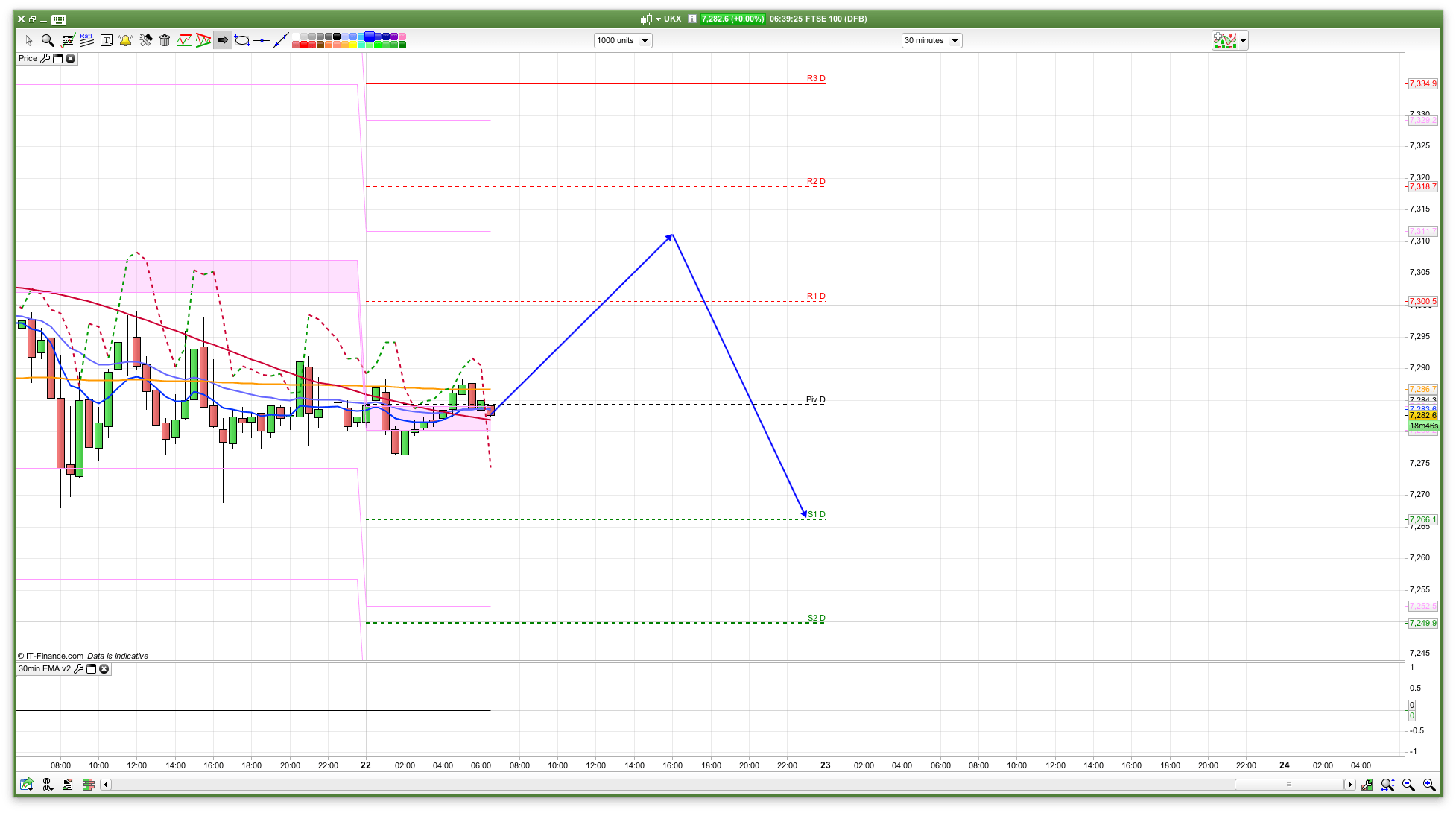 For today I am expecting a slowly bullish day with a rise up towards 7311 with a generally flat sort of feel till later on, when the divi expectation livens things up. We have bearish 2 hour chart at the moment with resistance at 7300 with a coral line there, and we dropped off the Hull moving average at 7301 yesterday. The 30min chart is a bit of a mess to start with today with just that sideways action not giving a clear picture and lots of bunching of candles, moving averages, daily pivot etc as you can see below. It is however on a weak bull to start with as I write this. The bulls will be keen to close above 7310 at some point this week as it keeps the hope of 7360 alive, however they are not really able to follow the other markets up at the moment, with cable tempering the bullishness.