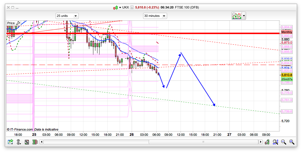 The FT100 was dragged lower by a falling oil price and broker downgrades in the banking sector. After the sharp moves up over the last two trading days it was probably inevitable that any excuse for some profit taking would kick in. There was some early buying which followed through from Friday however this quickly dried up as some traders continue to sell into any rally. Its looking like 5960 will be as high as we get on that leg up from 5600, as today I am looking at a short around the 5850 area on any early morning rise.