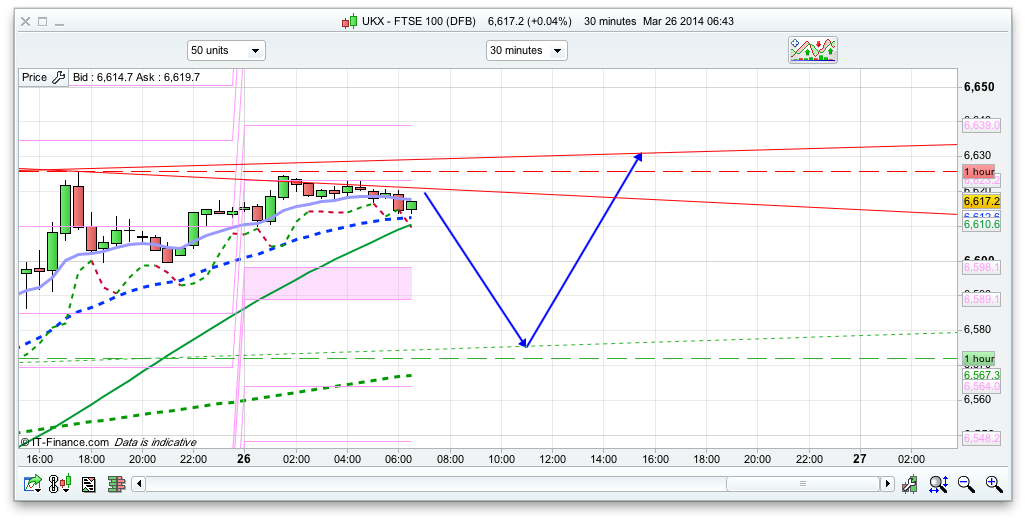 The reason I have gone for the initial dip is that as you can see on the 30minute chart, there are a cluster of resistance lines around the 6620 to 6630 area.