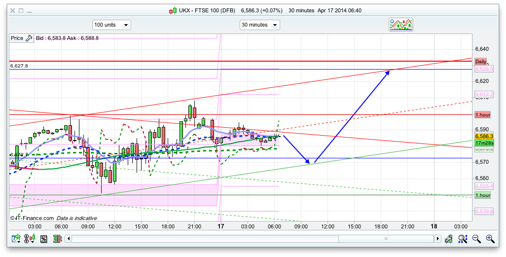 Good morning. Nice for yesterday to follow the plan with the dip to the pivot and then rise again, though it topped at the 6606 area very late in the day, rather than the ultimate target of 6626. 6670 is still on the radar though for the short term! Todays pivot is 6574, same again? Last day of the week today of course before 4 days off with the FTSE closed Friday and Monday. The US is open and trading on Monday though. The FTSE has dropped back a little overnight after breaking that 6600 level so the bulls weren’t keen to break the 10 day Bianca channel in the end (sits at 6609 today).