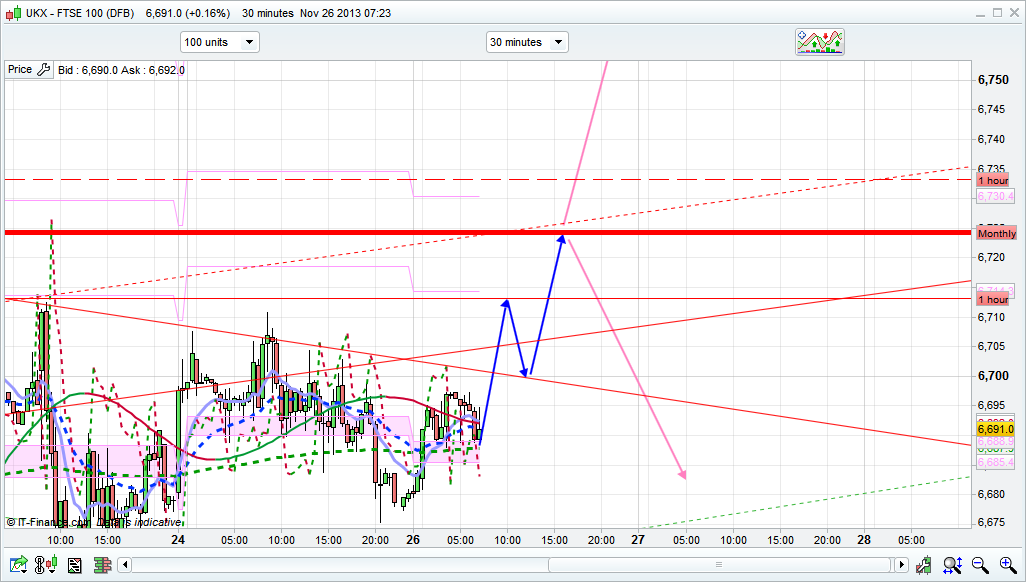 I’m just going to start by talking about the S&P and it dropped off quite well from the 1810 (near enough) area yesterday to 1800 before staging a bounce. If the bears have another go then 1800.5 yesterday’s low) is the level they will need to break to target 1794, whilst movement above 1809 should see the 1814 level. US thanksgiving holiday later this week should in theory be creating a fairly upbeat populace so I am inclined to maintain the bull side for the moment. Onto the FTSE. As mentioned above it was pretty flat yesterday with not a lot happening. I am still bullish, providing that the bulls can break 6711. This level has provided quite a bit of resistance but the more its tested the higher the chance that its going to break. If it does then I can see quite a quick climb to 6750+ on the proviso that the ProTrend line at 6723 doesn’t also act as resistance. I have plotted pink arrows from that level as it’s a bit 50/50 really what it does at these resistances, 6711 and 6723 are both fairly key and possibly jumping both hurdles is a big ask, though as mentioned, if it does then a run to 6750 is likely.